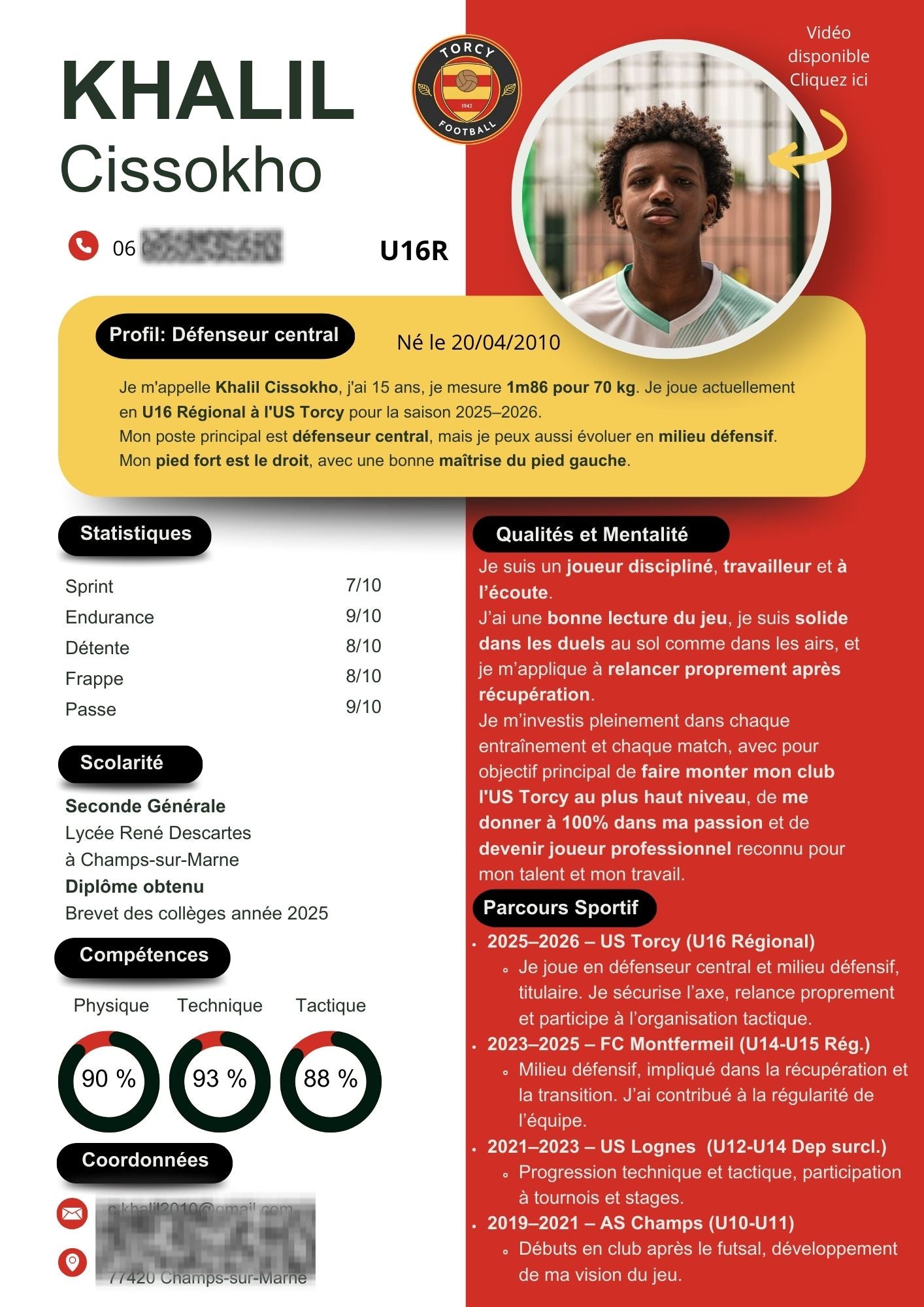 Je m'appelle Khalil Cissokho, j'ai 15 ans, je mesure 1m86 pour 70 kg. Je joue actuellement en U16 Régional à l'US Torcy pour la saison 2025–2026.
